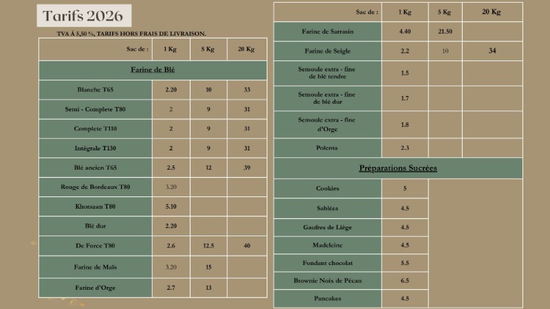 vous proposent toute une gamme de farines produites sur la ferme de Forest. Obtenues à partir des céréales cultivés sur la ferme, nos farines artisanales sont produites grâce à un moulin à meule de pierre (granit). Les céréales sont rigoureusement triées et nettoyées avant d'être moulues. Sans additif ni conservateur !